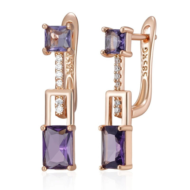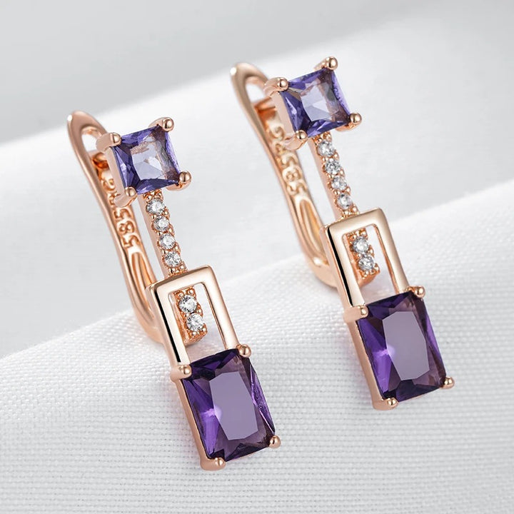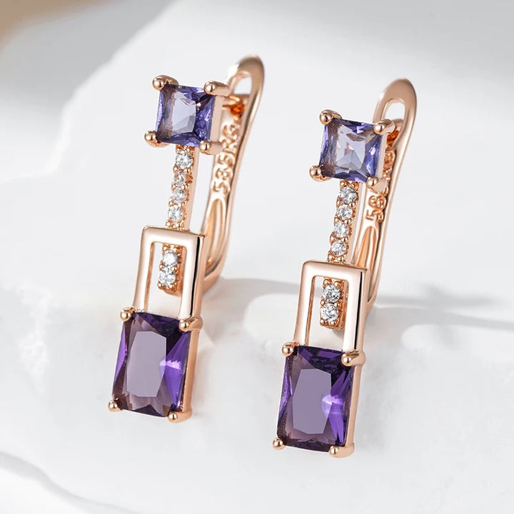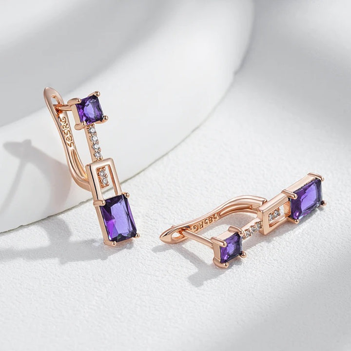 • Designul lor sofisticat include pietre de ametist tăiate în forme dreptunghiulare, care captează lumina într-un mod fascinant. Cristalele clare intercalate adaugă un plus de strălucire, completând perfect structura subtilă și rafinată a cerceilor.