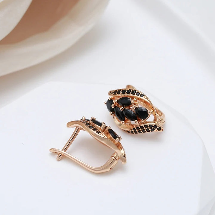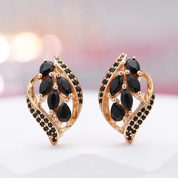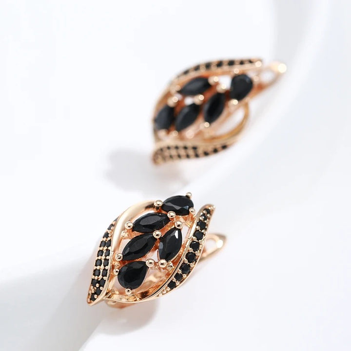 • Designul lor include multiple pietre de obsidian tăiate în formă marquise, aranjate într-un model complex de frunze și încadrate de cristale de obsidian mici și strălucitoare. Obsidianul creează un contrast uimitor și captivant cu montura de aur roz.