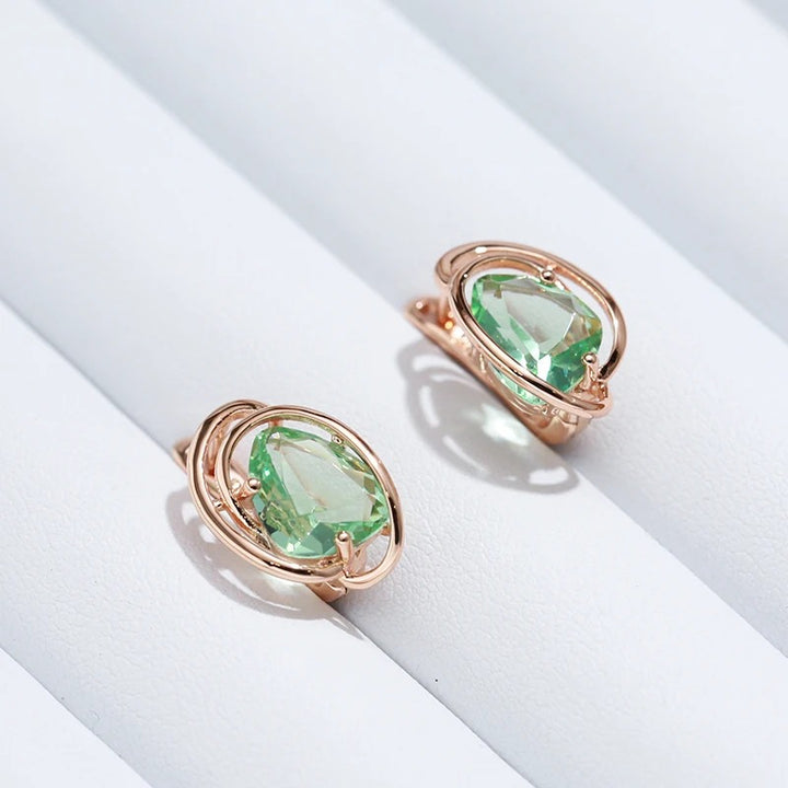 • Fiecare cercel include un cristal de topaz verde tăiat în formă ovală, montat într-o ramă exterioară din aur roz. Strălucirea subtilă a aurului roz completează perfect nuanțele de verde ale topazului, creând un contrast armonios și atrăgător.