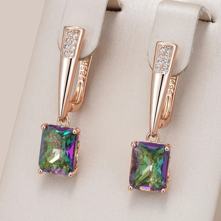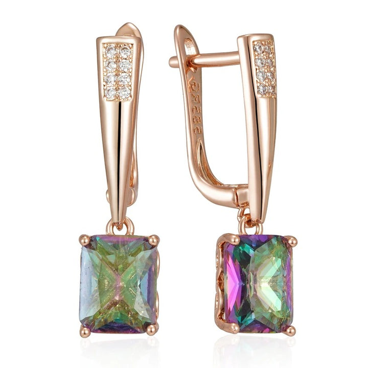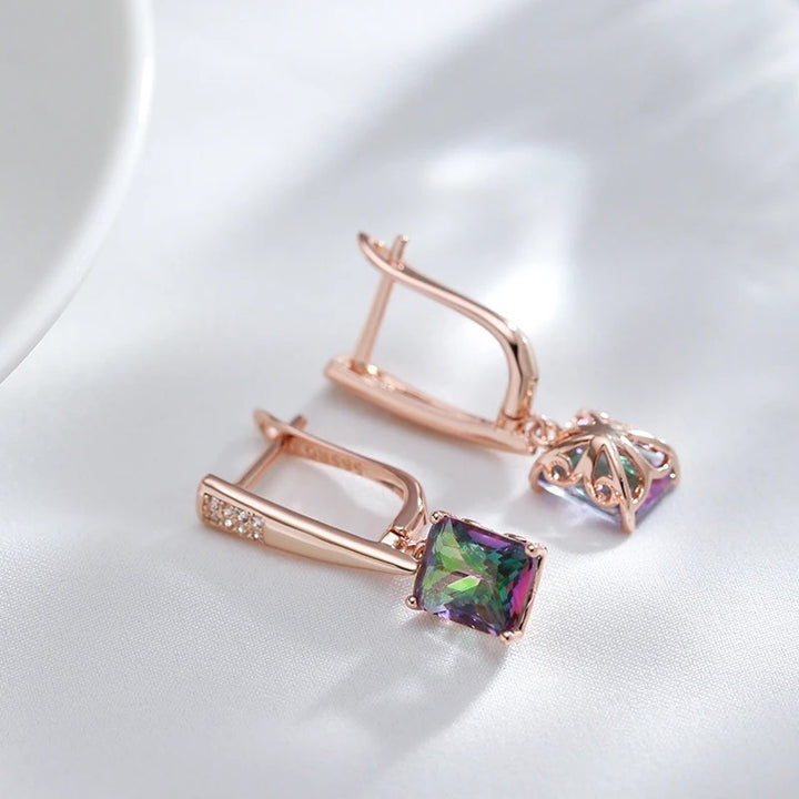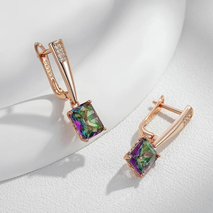 • Fiecare cercel include un cristal de topaz mistic tăiat în formă pătrată, care reflectă o gamă de culori iridescente, de la verde la mov și roz, schimbându-se în funcție de unghiul de vizualizare. Claritatea și strălucirea topazului adaugă o notă de magie și rafinament designului.