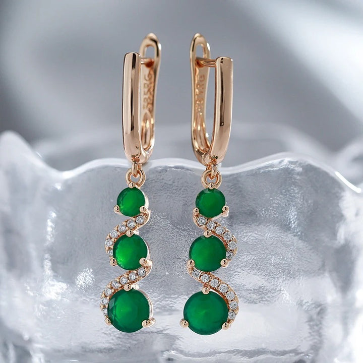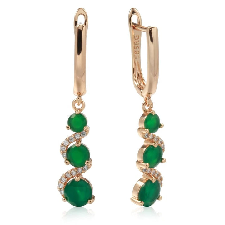 • Designul lor sofisticat include trei pietre verzi, dispuse în monturi delicate, intercalate cu benzi mici de cristale albe. Contrastul dintre tonul cald al aurului roz și verdele vibrant al pietrelor face ca acești cercei să fie deosebit de atrăgători.