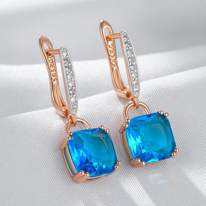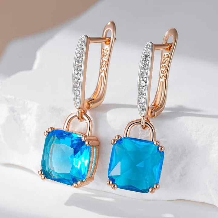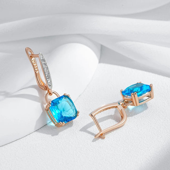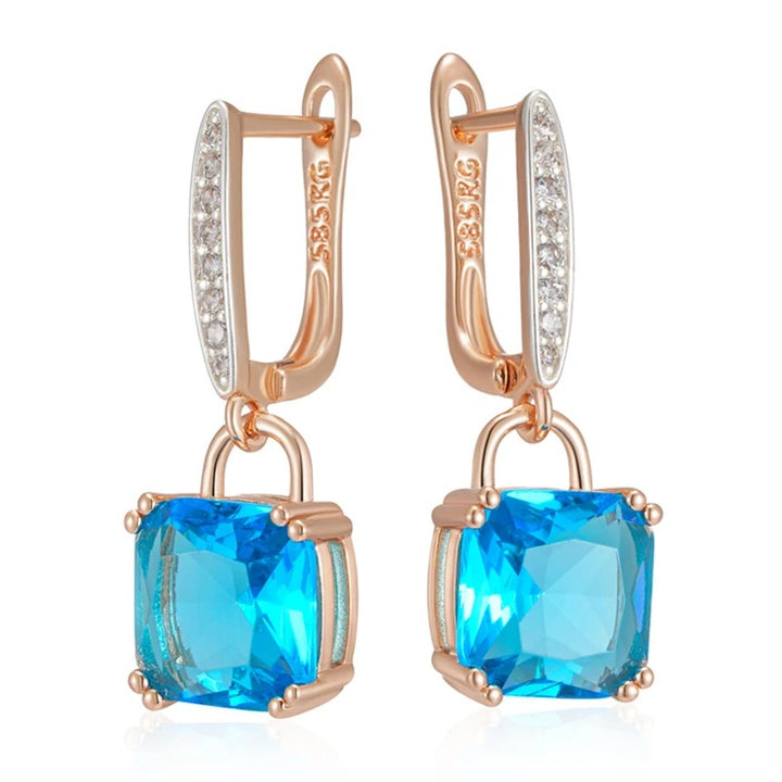 • Fiecare cercel include un cristal de zirconia tăiat pătrat, de un albastru intens, montat într-un cadru care scoate în evidență cristalul. Cerceii sunt decorați cu o buclă articulată, pe partea frontală a căreia sunt încrustate mici cristale clare, adăugând un plus de strălucire și rafinament.
