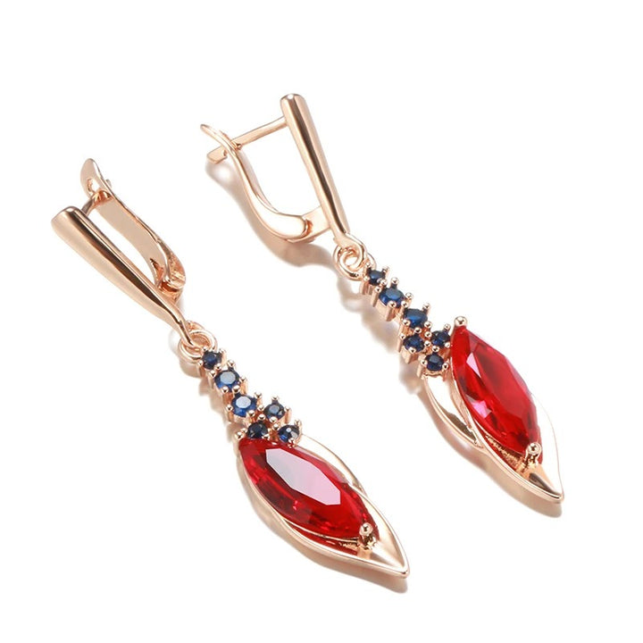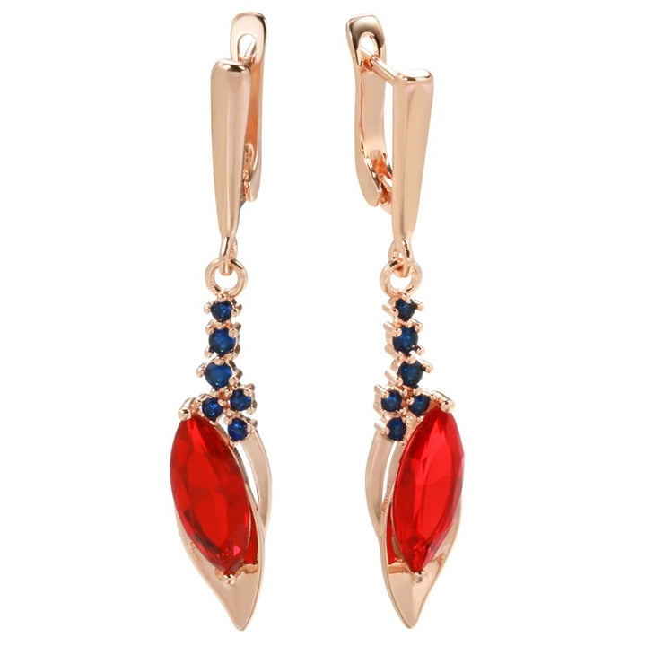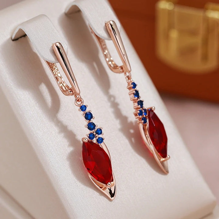 • Designul lor include un cristal zirconia tăiat marquise, de un roșu intens, situat în partea inferioară și încadrat de un șir vertical de mici cristale albastre rotunde, care adaugă un contrast uimitor și captivant.