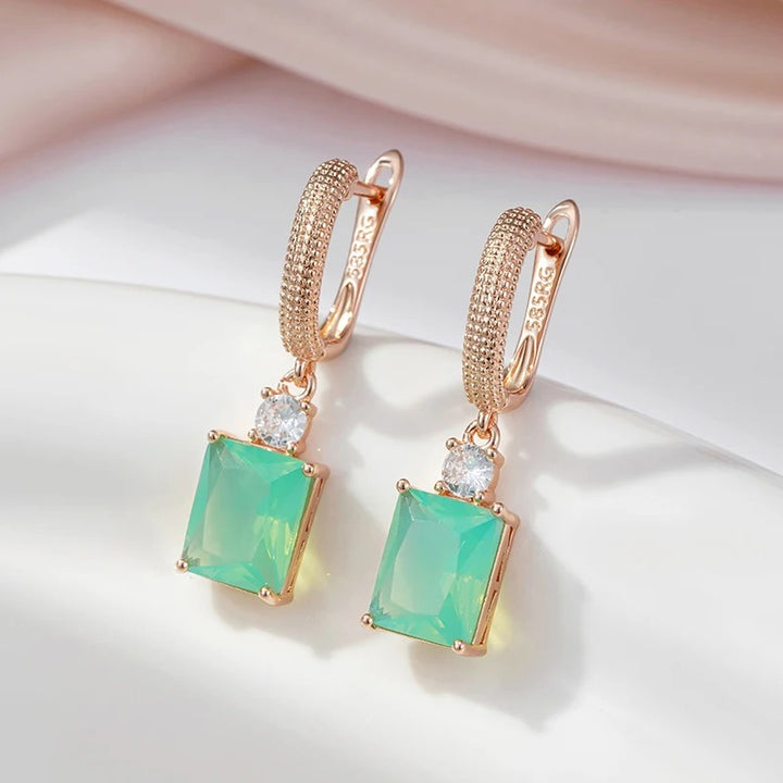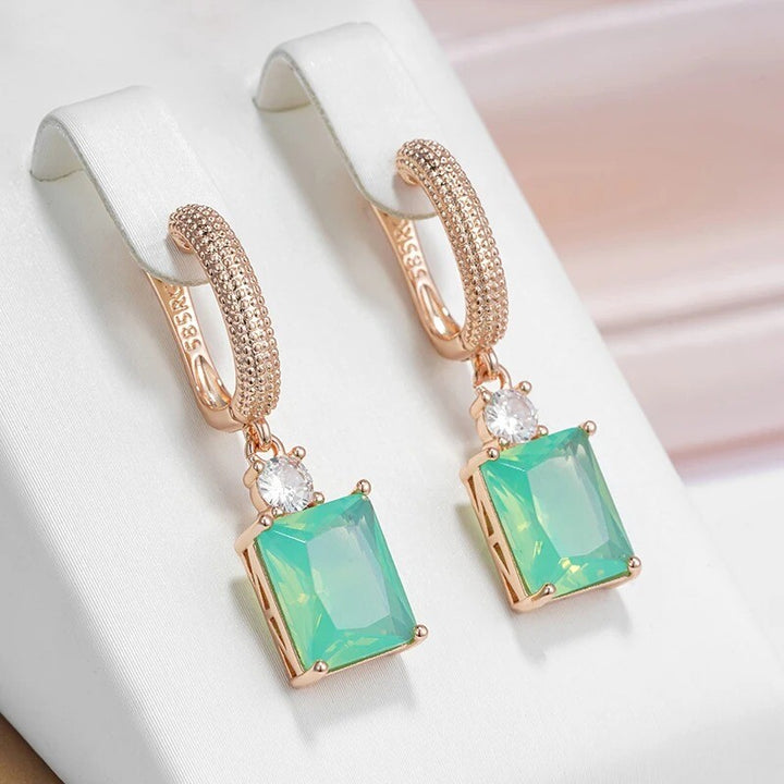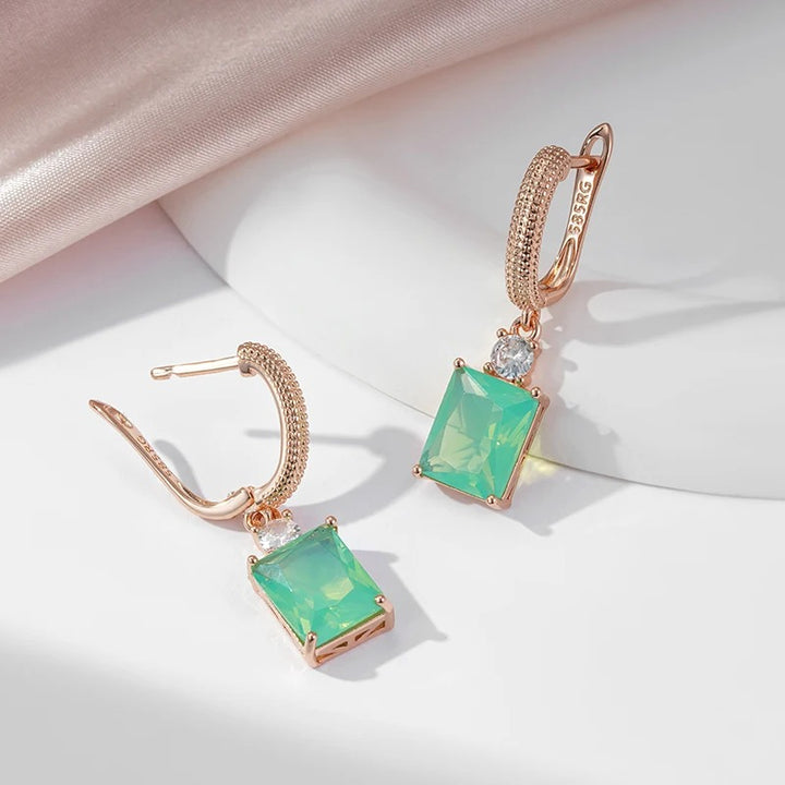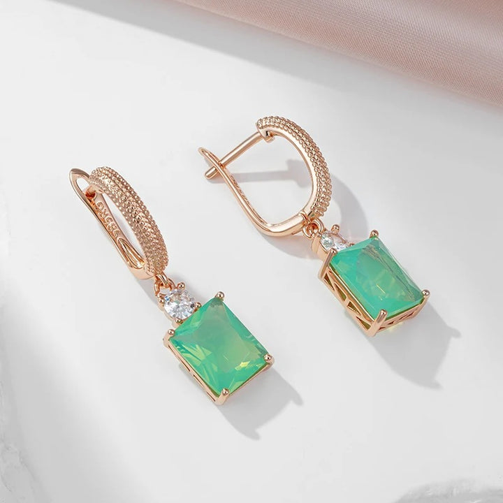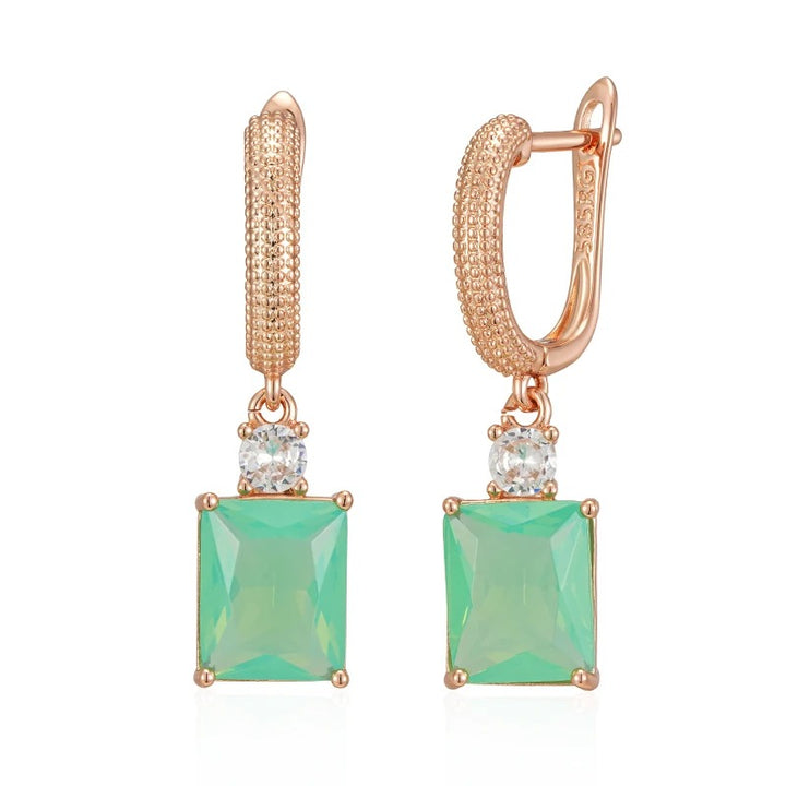 • Designul lor rafinat include o piatră verde tăiată în formă pătrată, care strălucește intens, completată de un cristal clar deasupra. Fiecare detaliu al acestor cercei reflectă o măiestrie desăvârșită, de la finisajul impecabil până la montura minimalistă care pune în valoare pietrele prețioase.