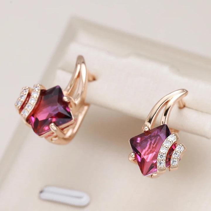 • Designul lor sofisticat include o piatră roșie-roz-mov tăiată în formă pătrată, care strălucește intens, completată de mici cristale clare pe o parte a monturii. Fiecare detaliu al acestor cercei reflectă o măiestrie desăvârșită, de la finisajul impecabil până la montura elegantă care pune în valoare pietrele prețioase.