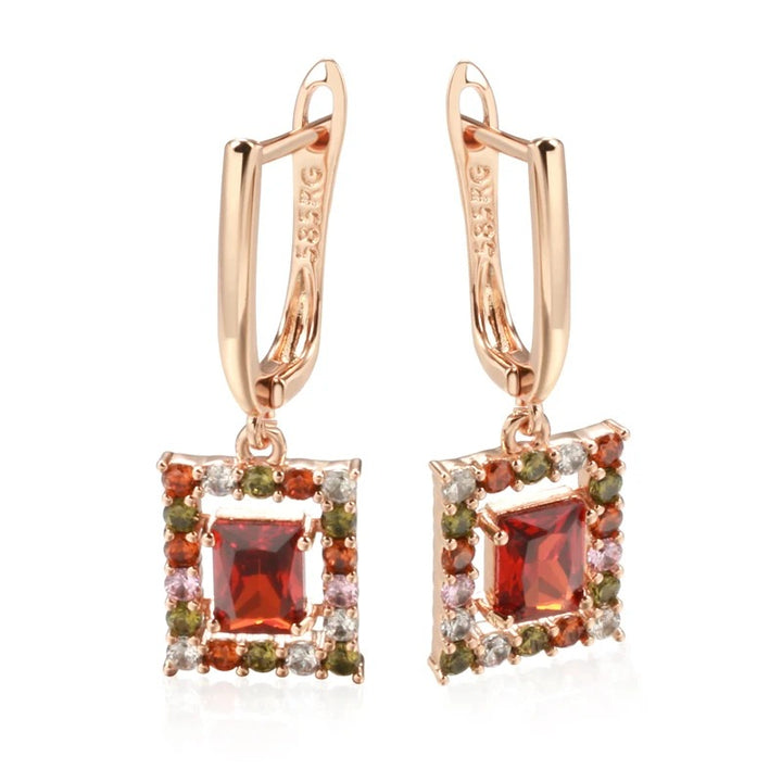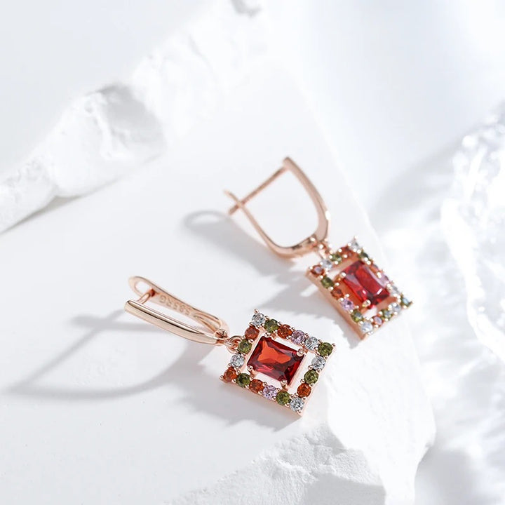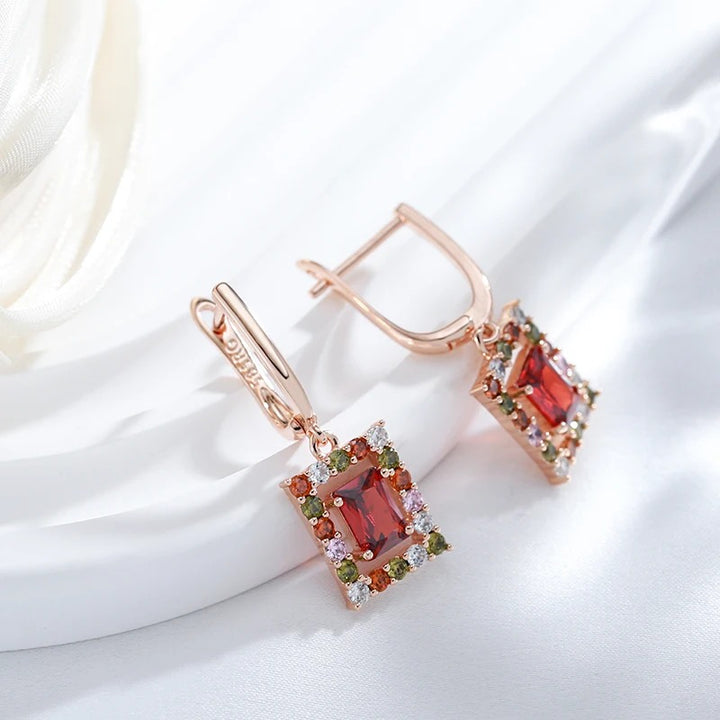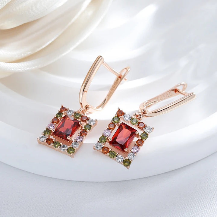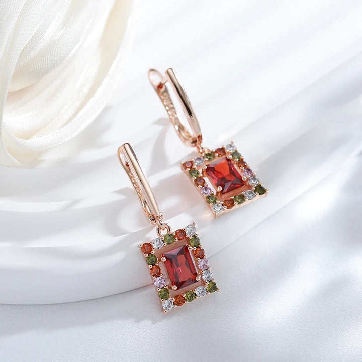 • Designul lor sofisticat include pietre de zirconiu tăiate în formă pătrată, de un roșu vibrant, care captează lumina într-un mod fascinant. Fiecare detaliu al acestor cercei reflectă o măiestrie desăvârșită, de la strălucirea intensă a pietrelor până la finisajul impecabil.