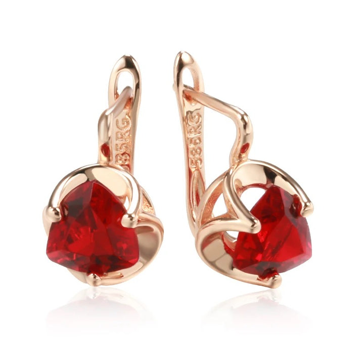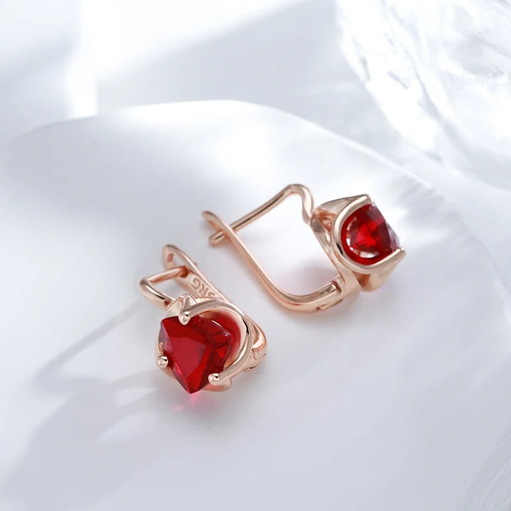 • Designul lor include cristale zirconia de formă inimioară, tăiate cu precizie pentru a oferi o strălucire intensă. Aceste cristale roșii vibrante sunt fixate în monturi delicate cu patru gheare care le completează perfect strălucirea.