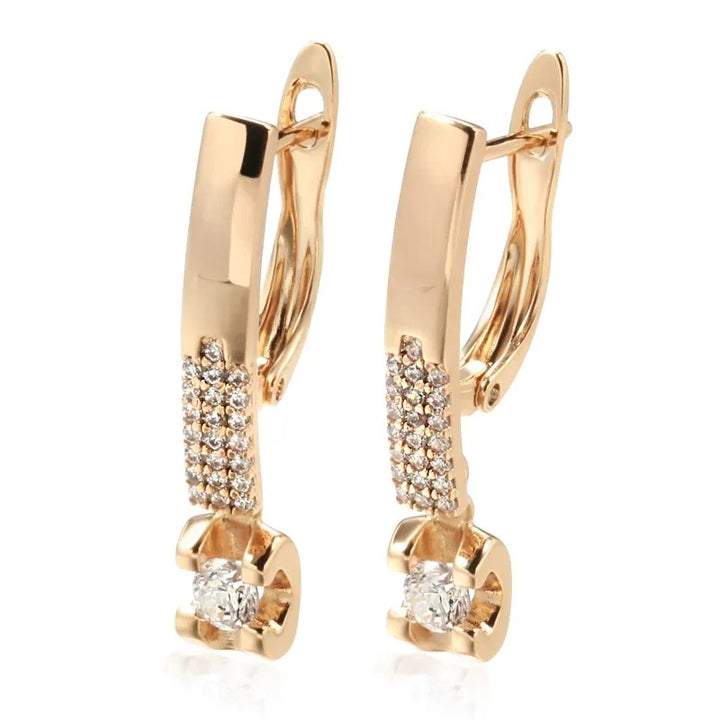 • Fiecare cercel include o serie de mici cristale clare rotunde, încrustate pe partea superioară, care oferă un efect strălucitor. Suspendat de această secțiune strălucitoare este un cristal mai mare, tăiat pătrat, care captează și reflectă lumina, sporind strălucirea cerceilor.