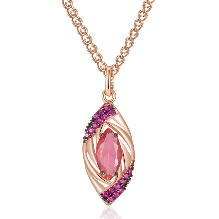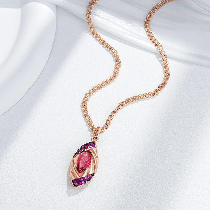 • Pandantivul include un rubin tăiat în formă de marquise, încadrat de un model elaborat din aur roz. Pandantivul este decorat cu mici cristale violet, care adaugă un plus de strălucire și eleganță piesei.