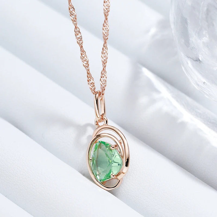 • Pandantivul include un cristal de topaz verde în formă ovală, cunoscut pentru strălucirea sa intensă și culoarea sa vibrantă. Designul pandantivului este elegant și modern, cu margini netede și rotunjite, care permit luminii să treacă prin cristal, amplificându-i strălucirea și culoarea.
