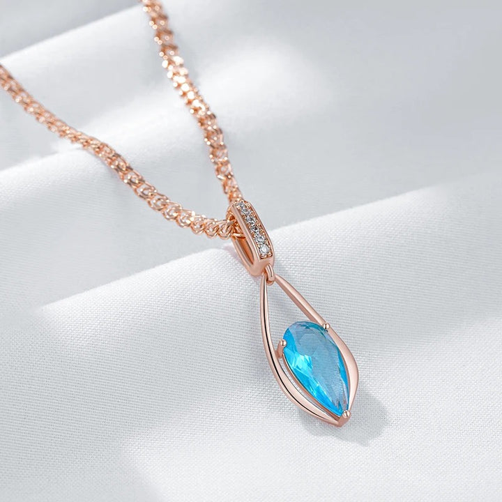 • Pandantivul este pus în valoare de un cristal de zircon albastru intens, cu tăietură tip lacrimă, încastrat într-o montură ce aduce aminte de valurile mării. Decorul suplimentar cu cristale fine pe prinderea pandantivului adaugă o notă suplimentară de eleganță.