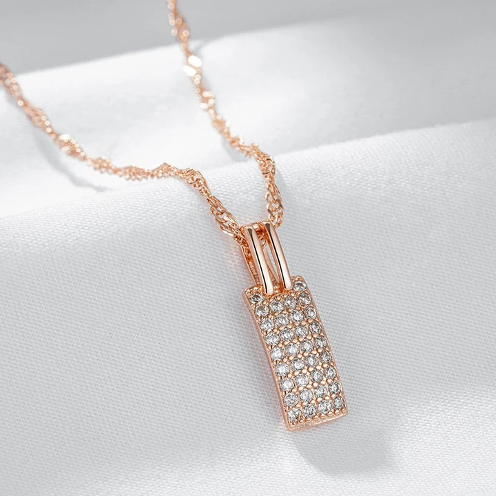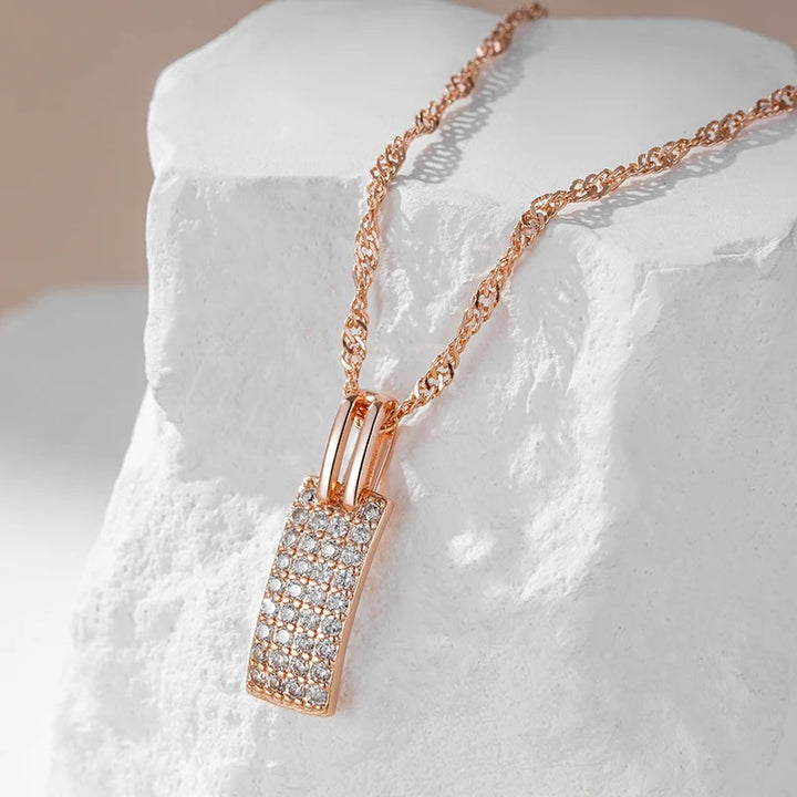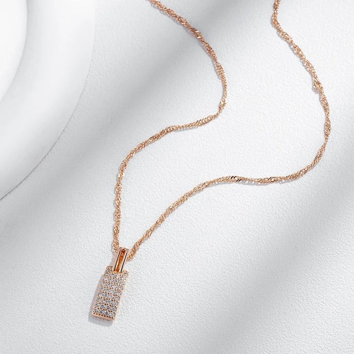 • Pandantivul include un dreptunghi incrustat cu mici cristale clare și strălucitoare, aranjate într-un model de tablou. Designul său luxos și elegant captează atenția prin strălucirea sa.