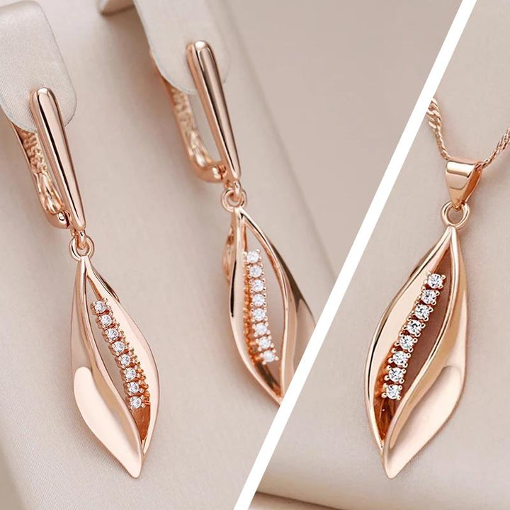 • Colierul se remarcă printr-un pandantiv asortat, cu aceeași formă de frunză stilizată și decorat cu un șir central de cristale strălucitoare, suspendat de un lanț delicat din aur roz, completând perfect perechea de cercei.