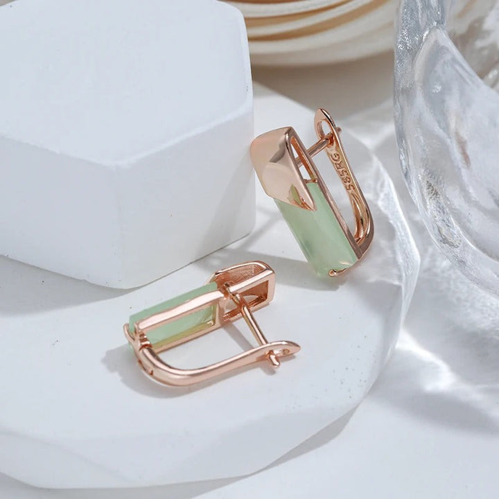• Cerceii prezintă un design geometric, cu o piatră de zirconiu verde alungită și tăiată rectangular, care se îngustează spre bază.