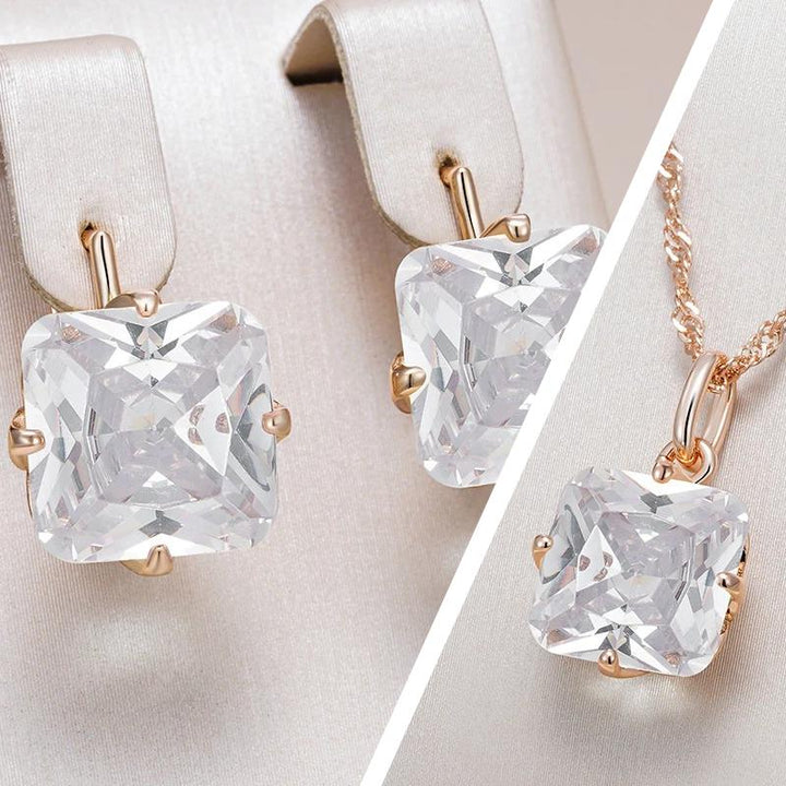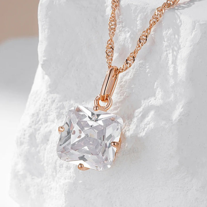 • Colierul se remarcă printr-un pandantiv asortat, cu un cristal de cuarț tăiat în formă pătrată, suspendat de un lanț delicat din aur roz. Acest pandantiv elegant completează perfect perechea de cercei, creând un ansamblu armonios și rafinat.