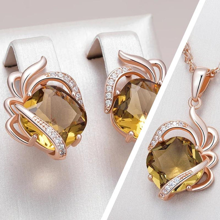 • Realizat din argint placat cu aur roz de 18K, setul "Golden Flower" îmbină eleganța naturală cu detaliile florale luxuriante, oferind o bijuterie deosebită pentru momente speciale.