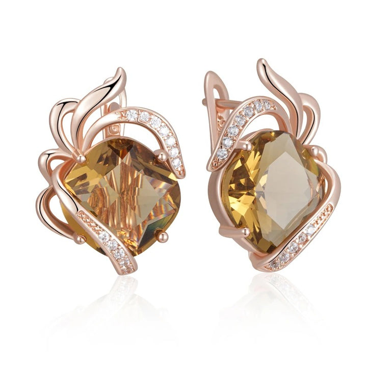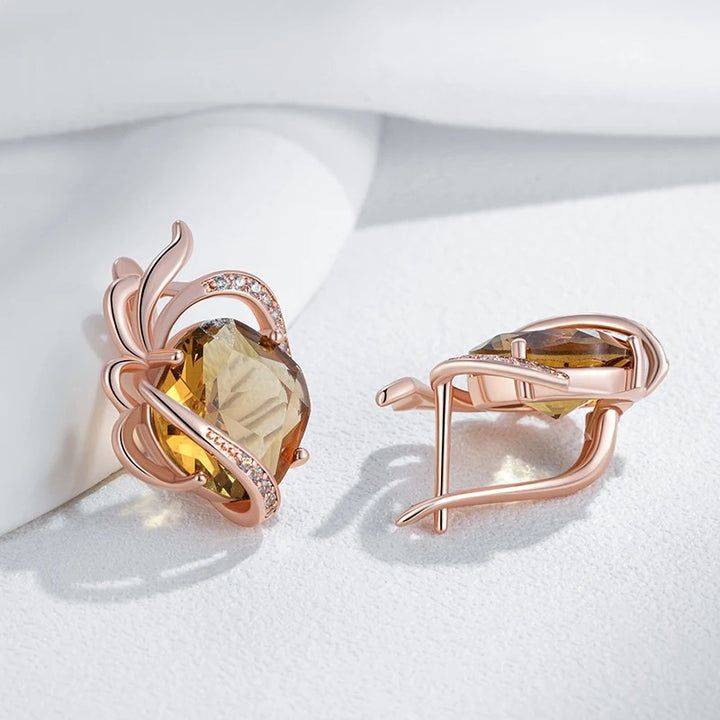 • Cerceii sunt împodobiți cu cristale de cuarț maro, tăiate în formă pătrată cu colțuri rotunjite, înconjurați de un decor floral grațios. Liniile curbe, împodobite cu cristale albe strălucitoare, evocă petale ce se deschid în jurul cristalului central, aducând un plus de volum și rafinament.