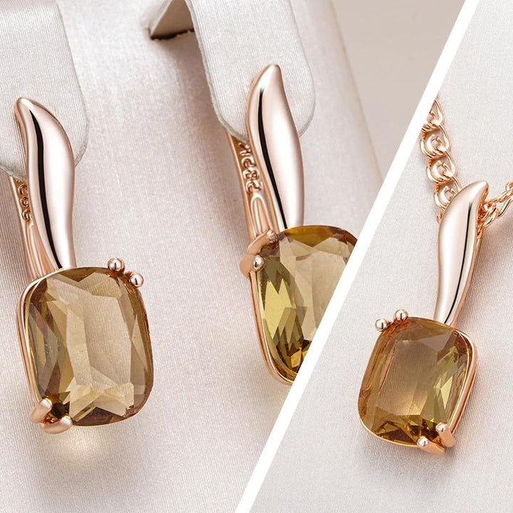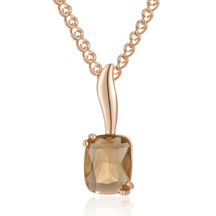 • Colierul se remarcă printr-un pandantiv asortat, cu un cristal de cuarț maro tăiat în formă dreptunghiulară, fixat într-o montură similară din aur roz, suspendat de un lanț răsucit, completând perfect perechea de cercei.