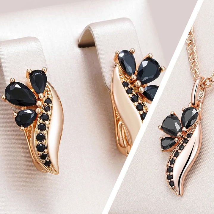 • Realizat din argint placat cu aur roz de 18K, setul “Black Orchid” este o alegere sofisticată și strălucitoare.