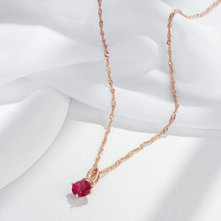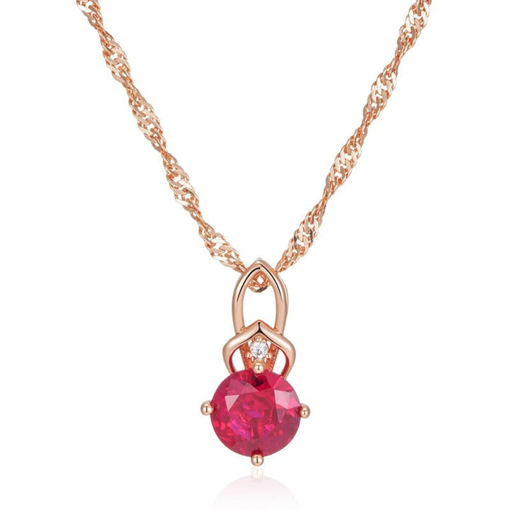 • Colierul reflectă designul cerceilor, având un pandantiv similar, cu aceleași detalii și rubinul oval în centru, înconjurat de mici cristale. Pandantivul este atașat de un lanț delicat cu verigi răsucite, completând eleganța setului.