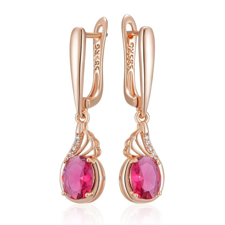 • Cerceii prezintă un design alungit, decorat cu gravuri intricate. Splendoarea cerceilor este dată de rubinul tăiat oval, accentuat de mici cristale, care adaugă strălucire și contrast culorii bogate fuchsia a rubinului.