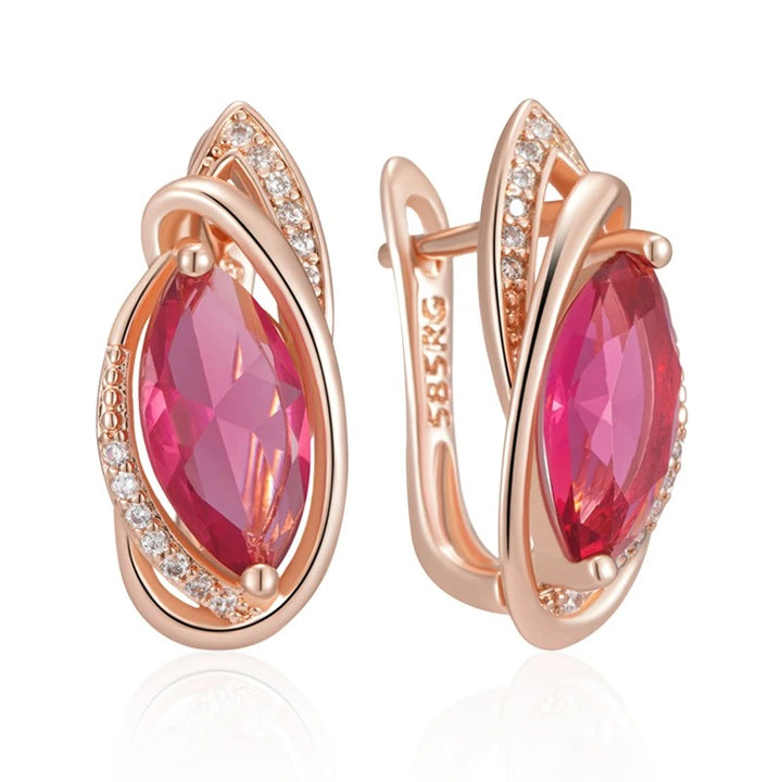 • Cerceii sunt decorați cu cristale de rubin, încadrate într-o montură delicată, cu linii curbe și elegante. Accentele de cristale albe adaugă o notă subtilă de strălucire și completează perfect designul armonios.