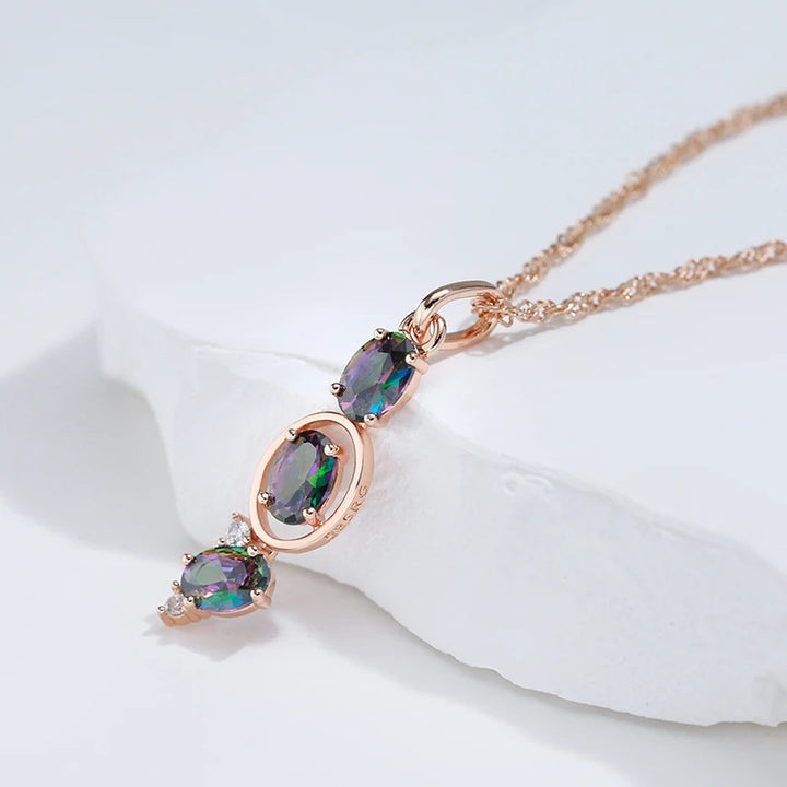 • Colierul se remarcă printr-un pandantiv asortat, cu cristale de topaz mistic ovale, încadrate într-o montură similară și suspendate de un lanț delicat din aur roz. Acest design spectaculos și multicolor adaugă un plus de strălucire și stil, creând un ansamblu armonios și elegant.