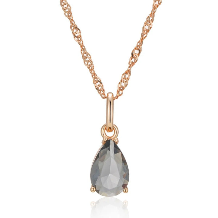 • Colierul se remarcă printr-un pandantiv asortat, cu un cristal de zirconiu gri în formă de lacrimă, suspendat de un lanț răsucit de aur roz, completând perfect perechea de cercei.
