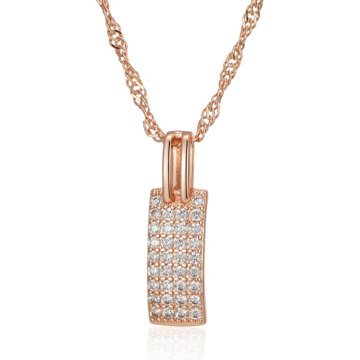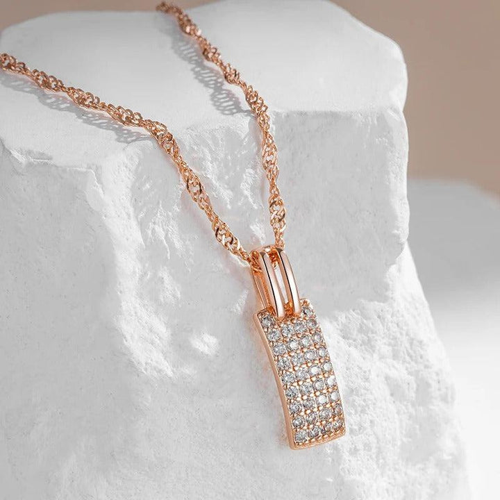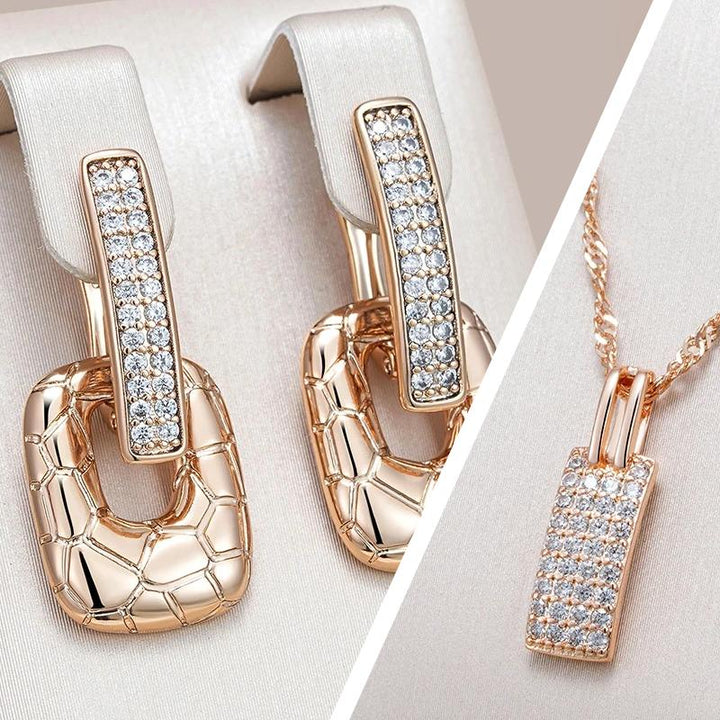 • Colierul se remarcă printr-un pandantiv asortat, cu un design dreptunghiular similar și decorat cu aceleași cristale mici, suspendat de un lanț răsucit din aur roz, completând perfect perechea de cercei.