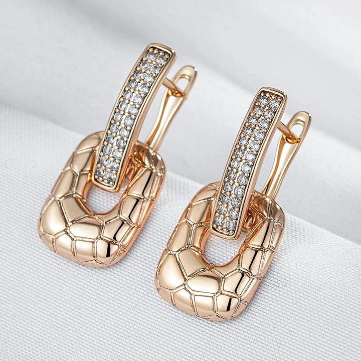 • Cerceii prezintă un design dreptunghiular, cu un model texturat asemănător pielii de șarpe, și sunt decorați cu multiple rânduri de cristale mici și strălucitoare, adăugând un plus de lux și eleganță. Montura aurie completează perfect strălucirea cristalelor.