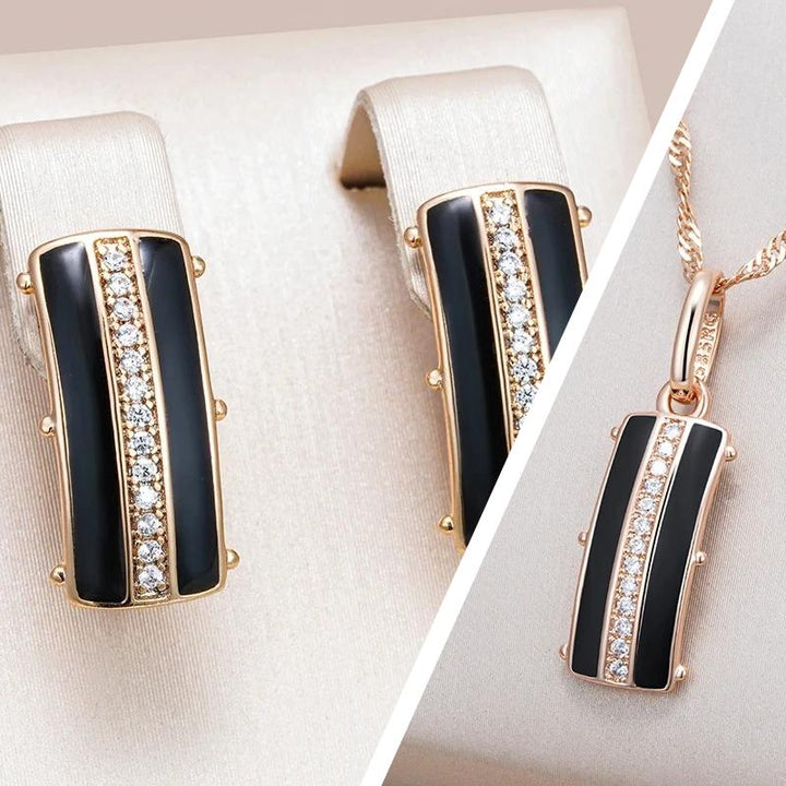 • Colierul se remarcă printr-un pandantiv asortat, cu un design dreptunghiular similar, având o bandă verticală centrală de material negru, flancată de rânduri de cristale mici și strălucitoare, suspendat de un lanț răsucit din aur roz. Acest design sofisticat completează perfect perechea de cercei, creând un ansamblu armonios și elegant.